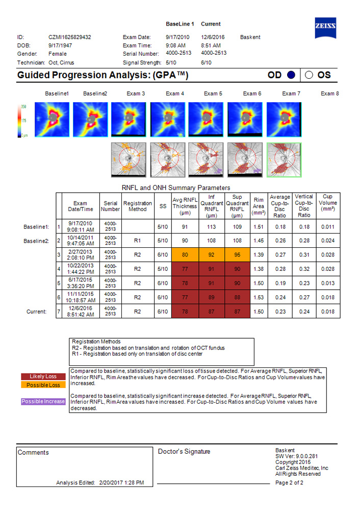 Tedavinin yeterli olup olmadığının anlaşılması ancak zaman içinde yapılan OCT testleri ve görme alanlarının birbirleriyle karşılaştırılması ile mümkündür. Bu iki cihaz içinde bulunan değişim programları ile yapısal ve fonksiyonel değişikliklerini ilk günkü testlerle karşılaştırmakta ve görme sinirinde bir kayıp yaşanıyorsa bunu doktora bildirmektedirler. Bu nedenle bu testlerin her zaman aynı doktor tarafından ve ayni cihazlarda yapılması gerekmektedir.